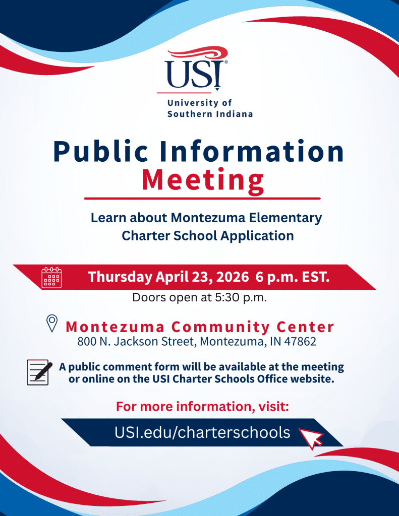 The University of Southern Indiana will host a public information meeting on Thursday, April 23 to discuss the application of a new elementary school option in Montezuma, IN.